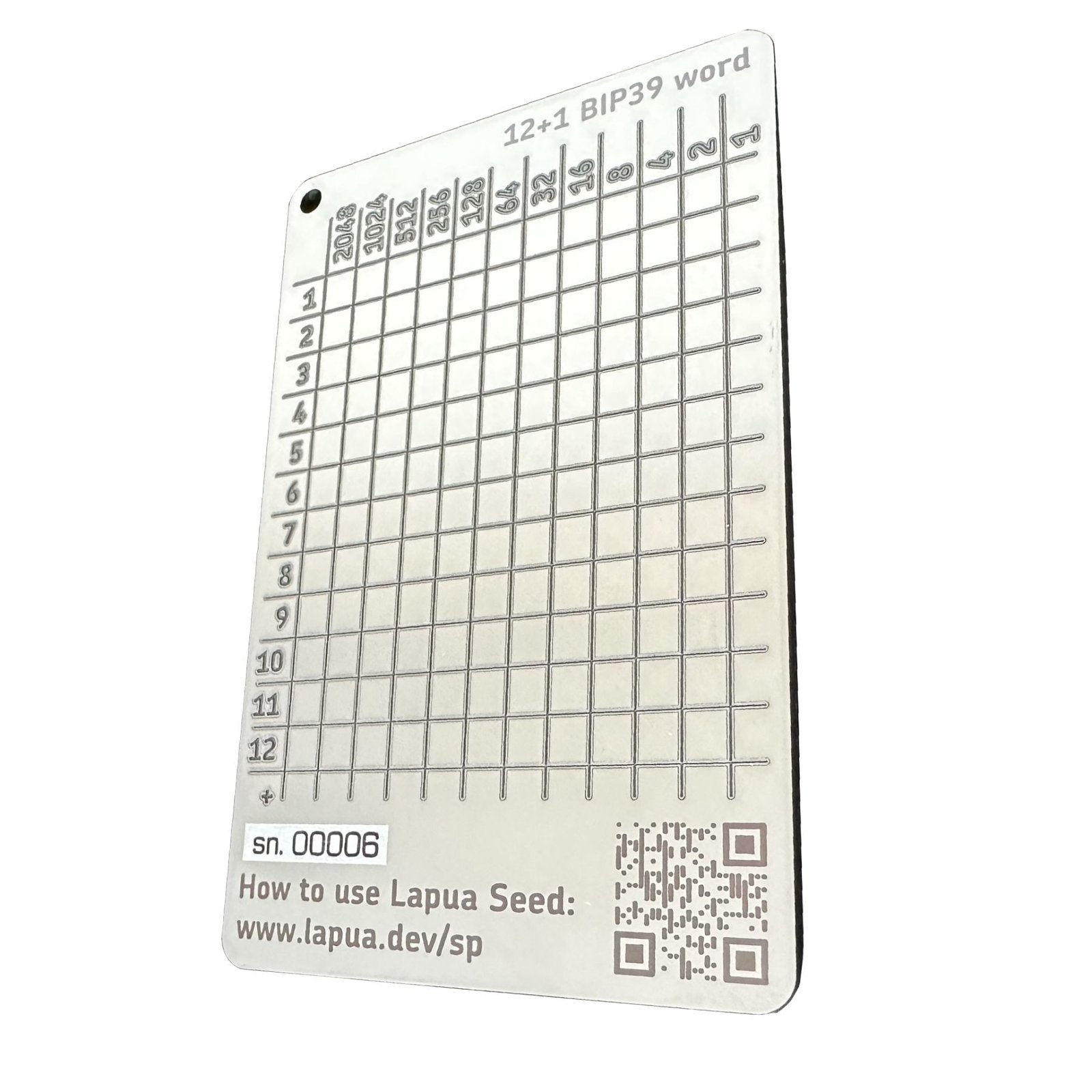 Существует много решений для хранения мнемонической фразы в металле — можно выгравировать слова на пластине или сложить их из букв в коробку или капсулу. Наш продукт концептуально иной. Lapua Seed содержит таблицу, каждая строка которой предназначена для записи одного слова из словаря BIP39.